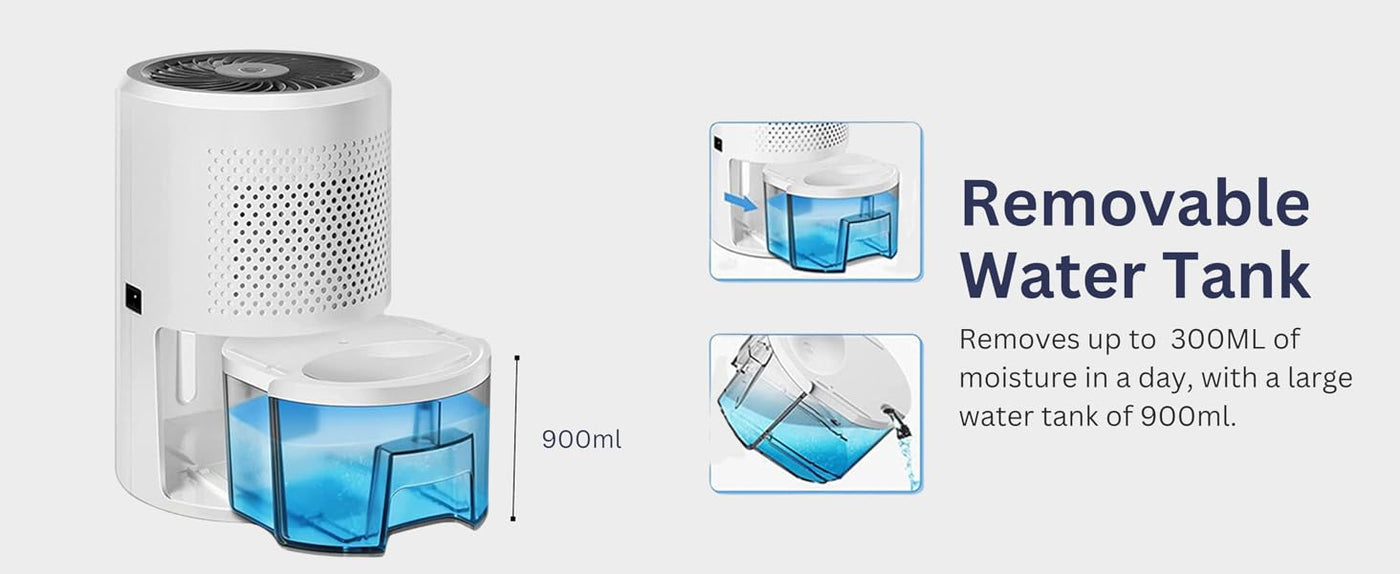 - [300 ML/DAY DEHUMIDIFICATION] Capable of removing up to 300 ml of water/moisture per day with a 900 ml water tank capacity. A visible water tank makes it easy to see the amount of collected water.