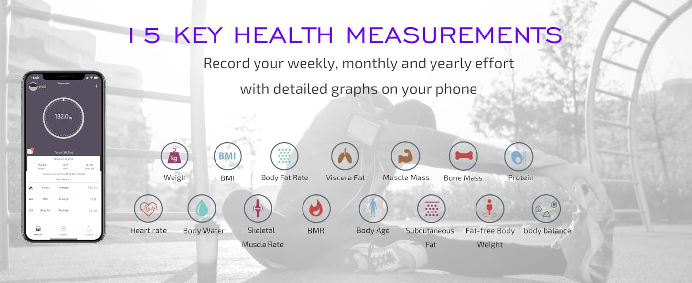 • 【Extra Large LCD Display】The large VA display of scale shows your 8 essential measurements, including body weight, body balance%, body fat%, BMI, water%, skeletal muscle%, heart rate and bone mass, help you get a clear view of your essential body measurements briefly.